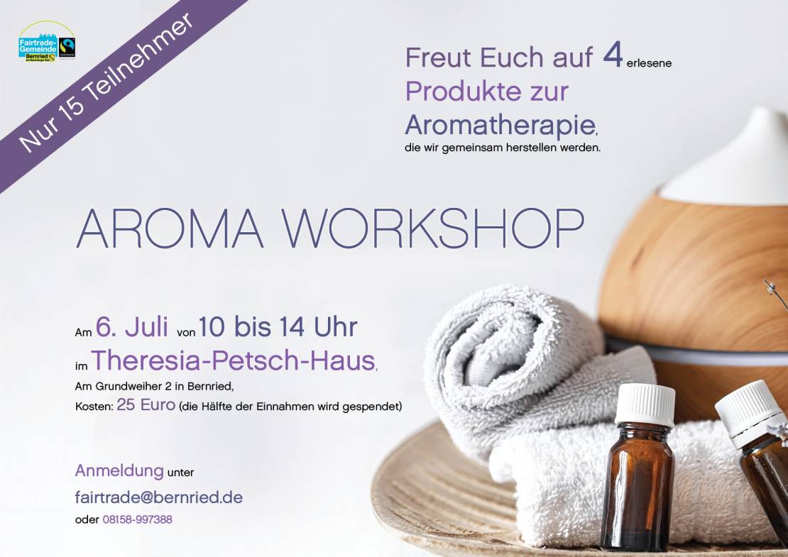 Im Sommer findet einer unseren beliebten Workshops, diesmal zum Thema “Aromaöle” statt. Wir hatten das Glück Claudia Schöffler, die sicherlich allen aus ihrer Physiotherapie-Praxis bekannt ist, zu gewinnen. Sie setzt die ätherischen Öle persönlich und auch in der Praxis ein und wird mit uns ihren großen Erfahrungsschatz teilen. Wir werden gemeinsam vier Produkte zu den Themen Stress, Familie, Detox und Verwöhnen herstellen und erfahren Vieles über die Wirkung der eingesetzten Öle und auch Öle im Allgemeinen. Auch hier spielt die faire Herstellung der Öle eine große Rolle.