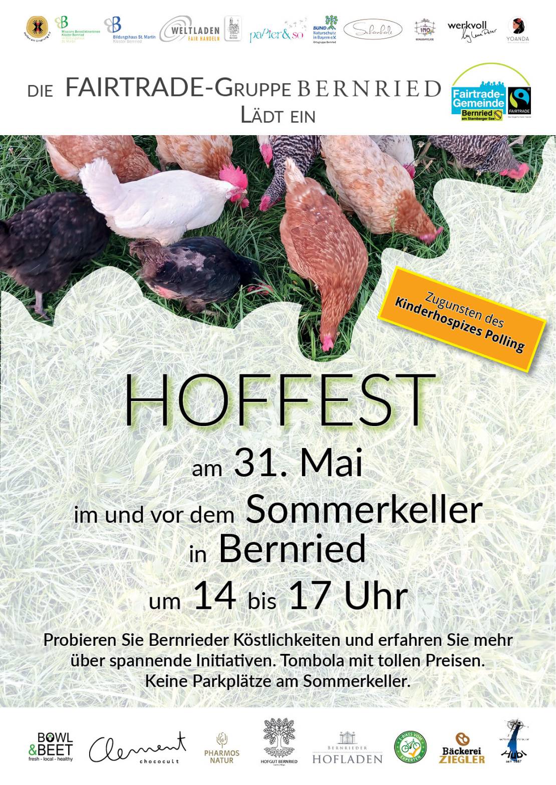 Am 31. Mai freuen wir uns auf die Neuauflage unseres Hoffests im Sommerkeller und – bei schönem Wetter - auf dem Vorplatz. Neben den bisherigen TeilnehmerInnen werden heuer auch Papier&So mit ausgewählter Papeterie und Geschenken, sowie auch E-Motion mit einigen Fahrrädern und die beiden Weltläden von Tutzing und Weilheim vertreten sein. Der Erlös der Tombola und alle anderen Spenden kommen dem Kinderhospiz in Polling zugute.